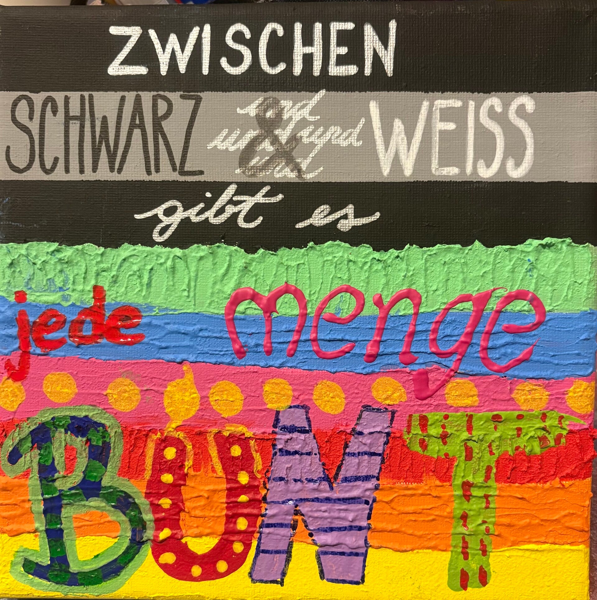 Meine Kunst steht für Mut zur Farbe und das Schöne im Unperfekten. Ordnung und Chaos gehören zusammen – und genau daraus entstehen Charakter, Energie und echte Emotion. Wenn dich ein Werk anspricht, findest du es im Shop oder du schreibst mir kurz für Details und Verfügbarkeit.