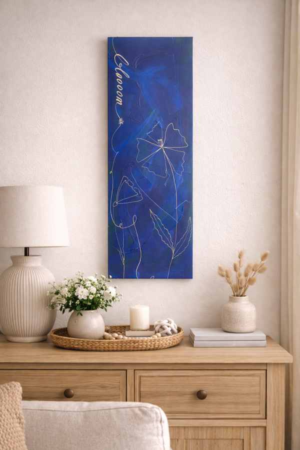 Tiefes Blau in Schichten, darüber feine Linien wie ein leiser Gedanke – und das Wort Bloom als Erinnerung ans Aufblühen. Ruhig, elegant, meditativ. Perfekt für Räume, die Atem und Klarheit brauchen.